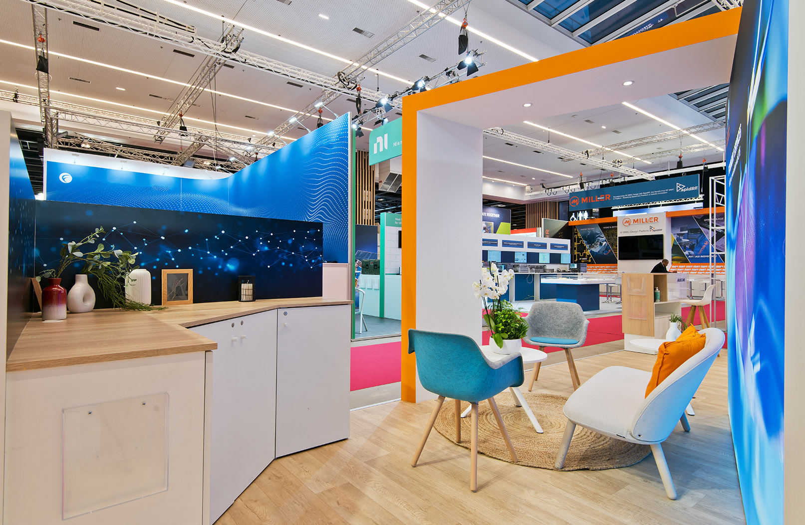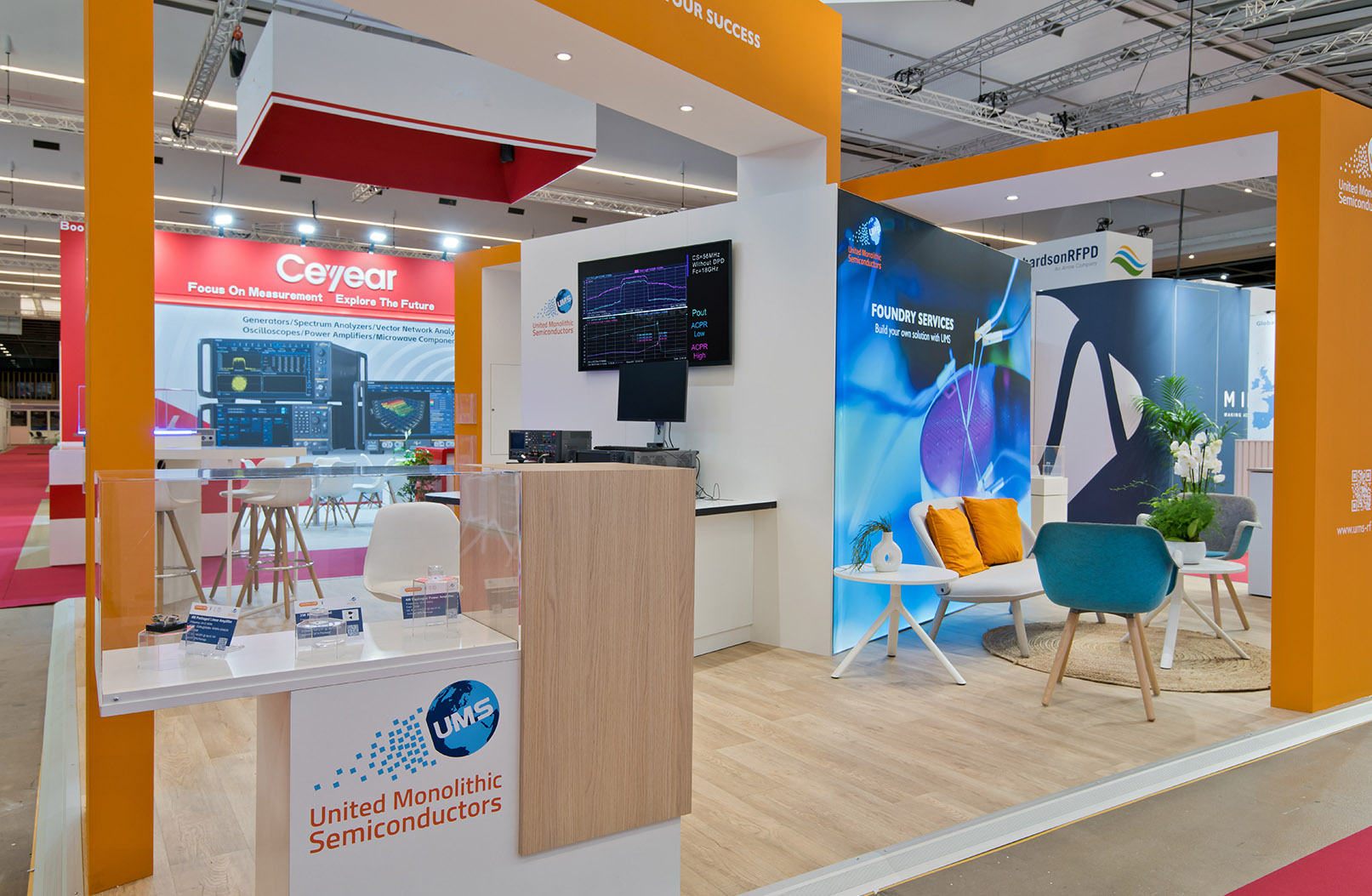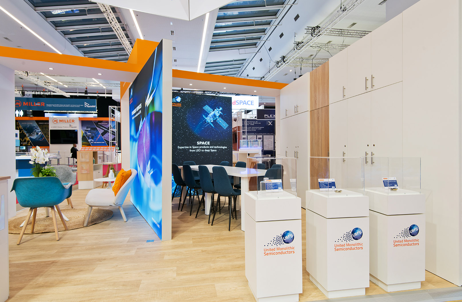 Le stand met en lumière les innovations microélectroniques d’UMS grâce à des vitrines produits élégantes et parfaitement intégrées dans l’architecture. Ces espaces d’exposition permettent de présenter les composants technologiques dans un environnement maîtrisé et premium.
